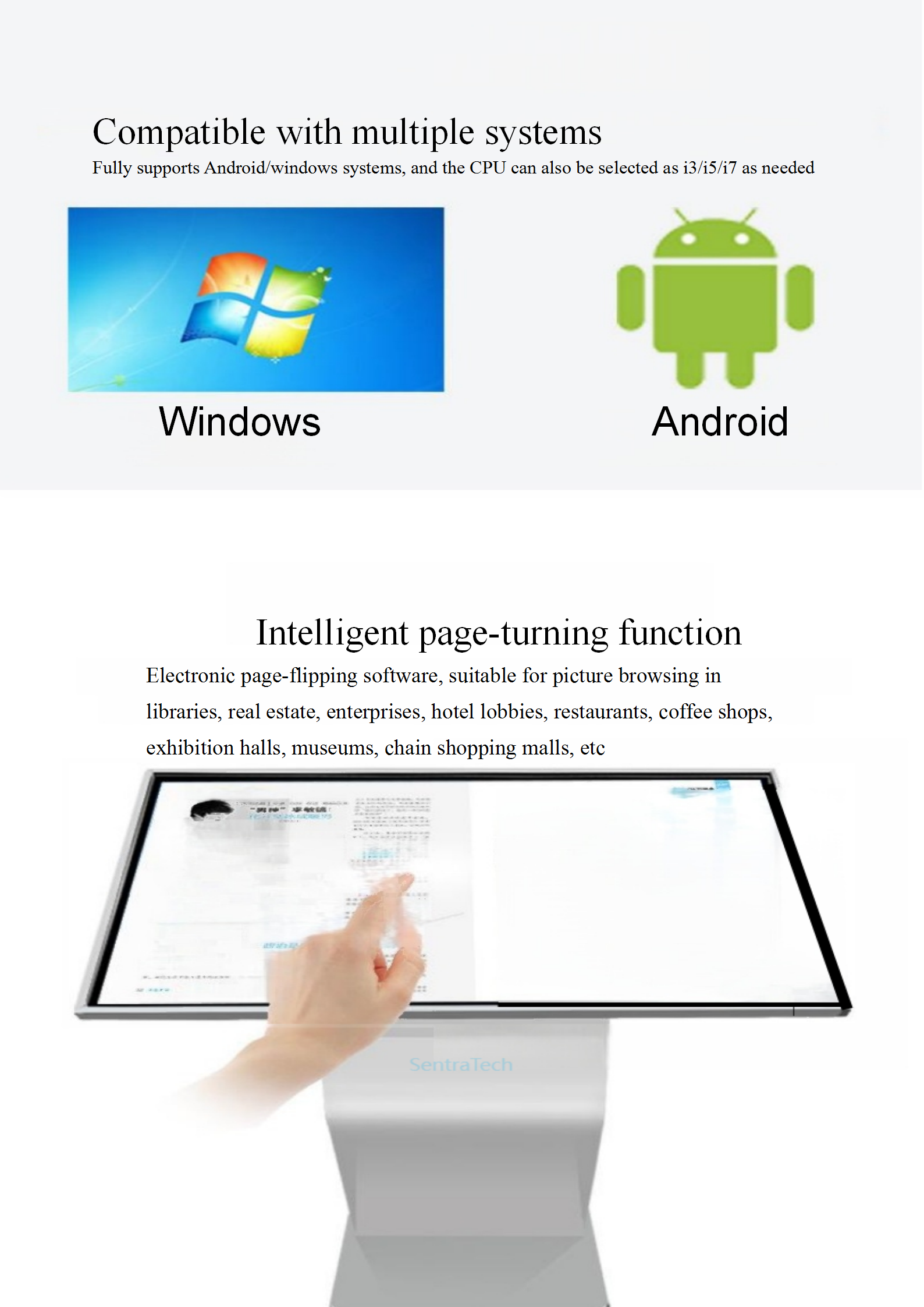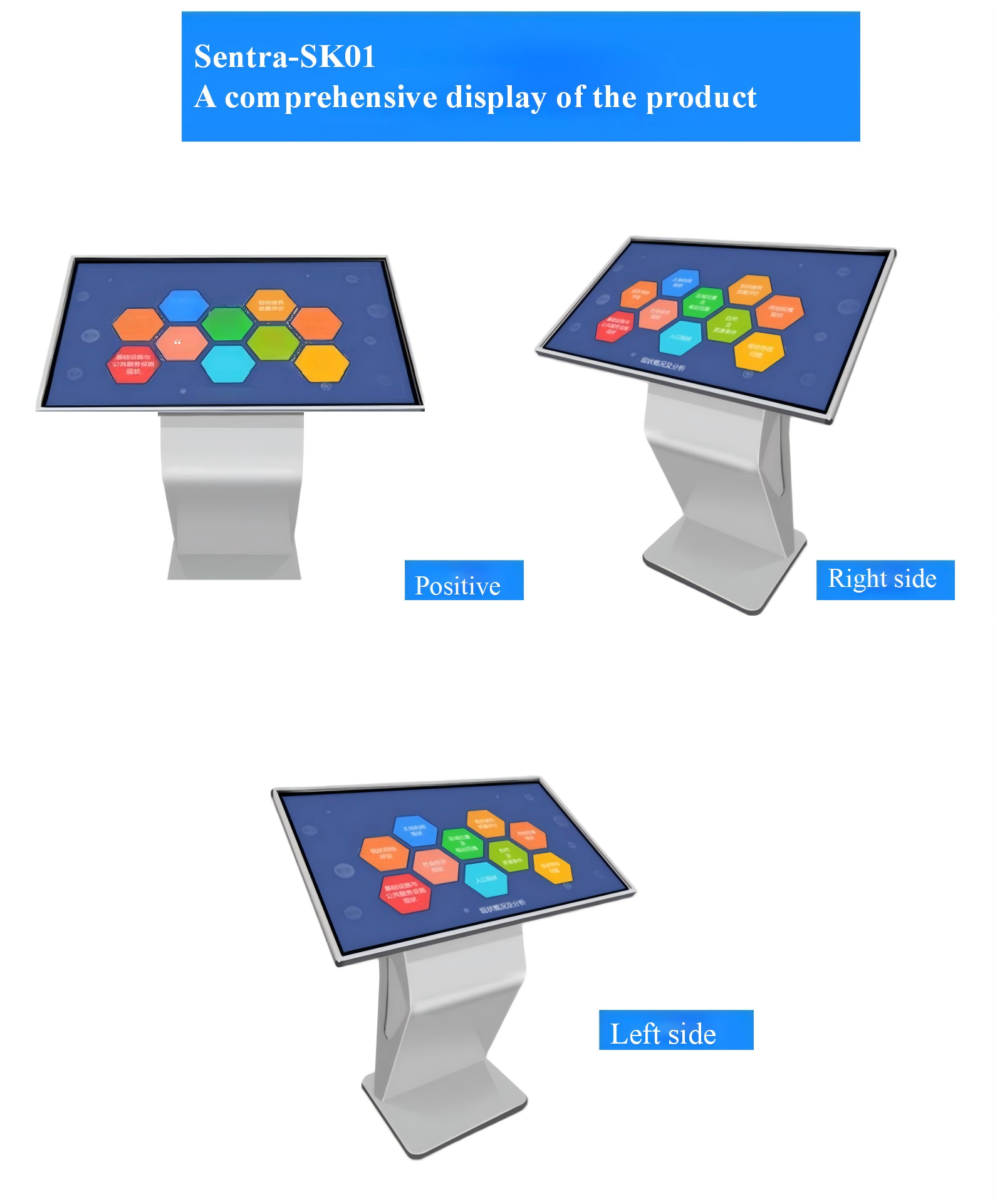 - Applicable scenarios: Advertising release, retail stores, shopping malls, displayed dishes, exhibition halls, self-service services, wayfinding, Airport