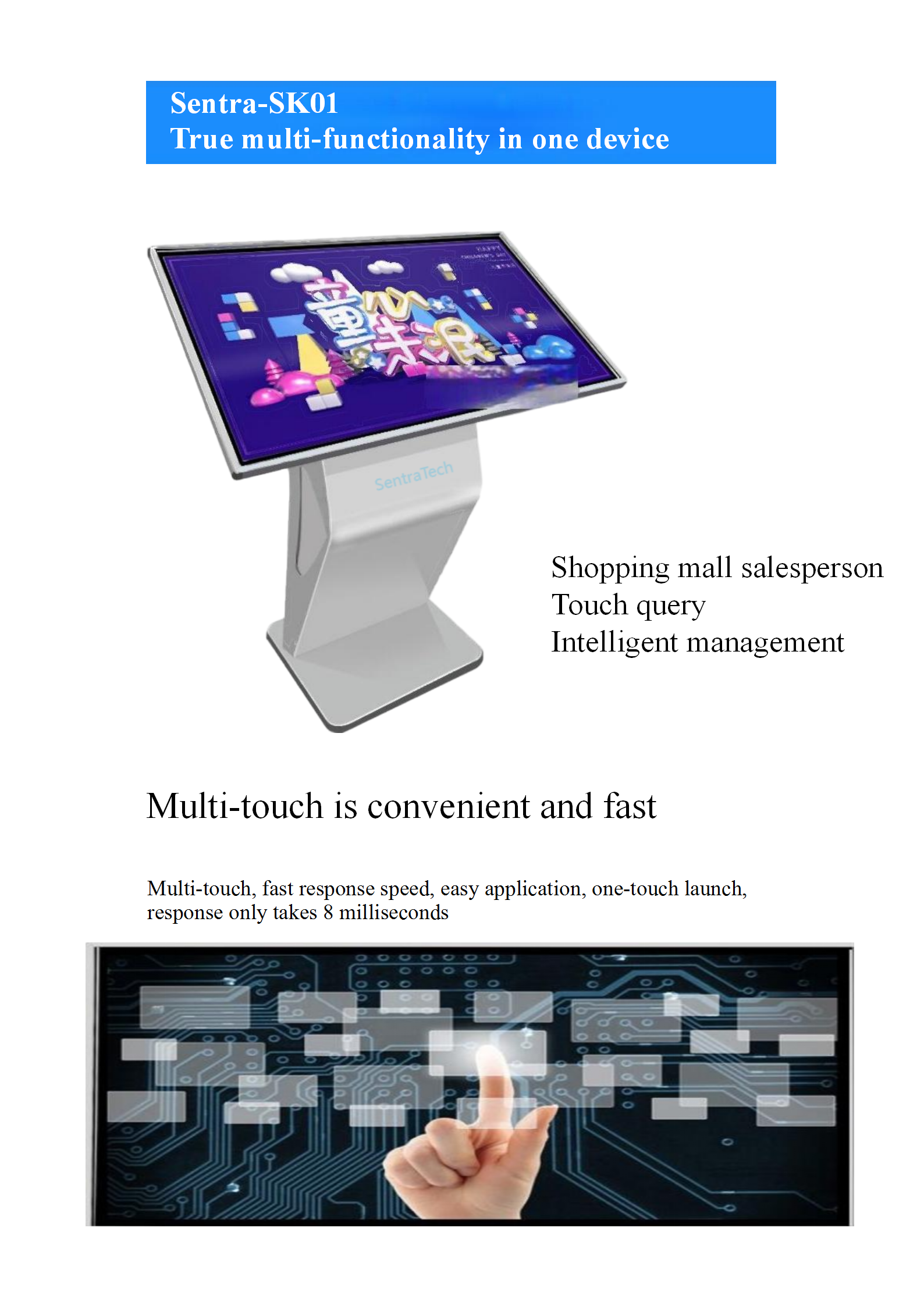 Sentra SK01 Integrated LCD touch screen information kiosk, used for advertising and event digital signage, available in various sizes